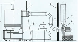 主机旋风分离器,布袋除尘器,高压离心通风机、操作台组成。由于干燥物料的性质不同,配套除尘设备时,可按需要而进行,可同时选择旋风分离器,布待除尘器。也可选择其中的一种。一般来说,比重较大的物料只需选择旋风分离器。比重较轻的物料需配置套布袋除尘器,并备用气力送料装置选择。