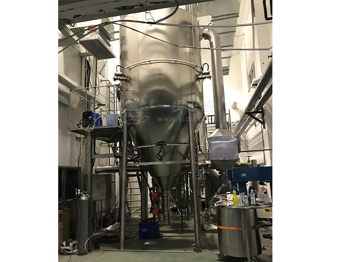闭路循环喷雾干燥机是在密闭的环境下工作,该系统采用惰性气体作为循环气体,对干燥的物料具有保护作用,循环气体经历载湿、去湿的过程,介质可重复使用;氮气经加热器加热后进入干燥塔,液体物料经螺杆泵输送至离心喷头处,液体被高速循环的雾化器雾化成液滴,在干燥塔内完成热质交换过程,被干燥后的粉状物料从塔底排出。